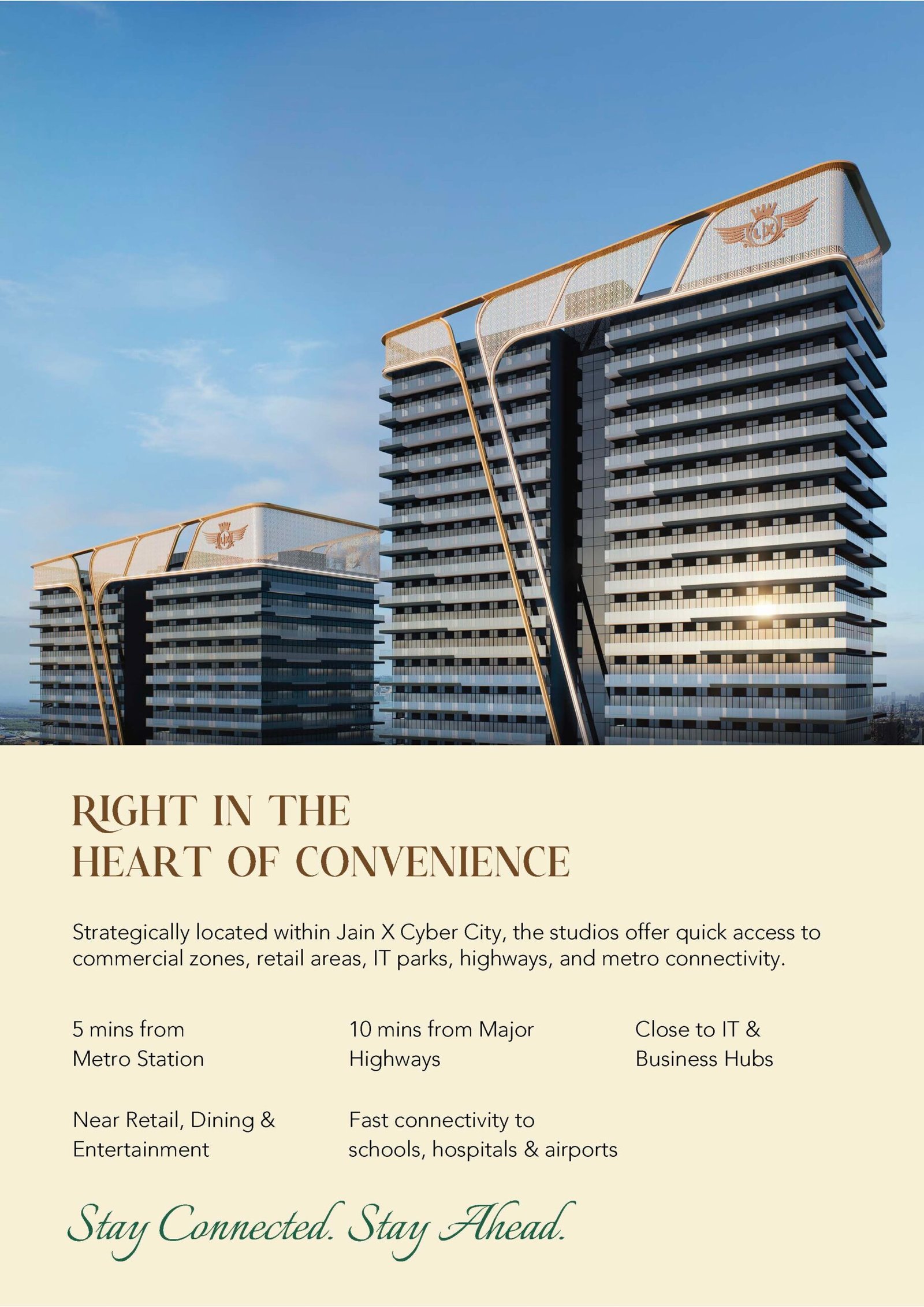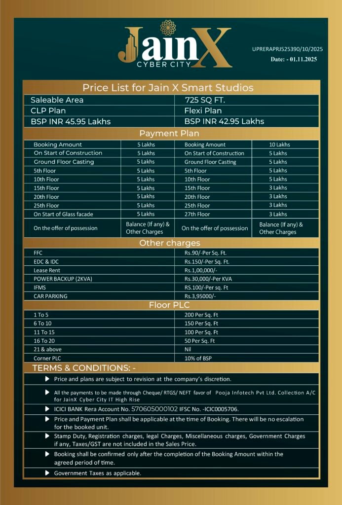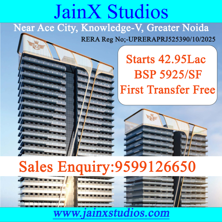 The most luxurious side of JainX Cyber City Studio Apartments in the commercial prosperity of Knowledge Park 5, Greater Noida is the best location where every real estate seekers and buyers want to fulfill their dream. It will be a limitless world of commercial prognostication with extraordinary professionals, doctors, recruitment authorities, and several financial, educational, and health institutions that will thrive lucrative commercial life and would make investments a key to your success in the above field of excellence including BPOs, KPOs, Data Centers, Clubs, Sales & Marketings, etc. The project offers a business life enhanced by first-rate facilities, modern furnishings, and a convenient location. Major educational institutions, medical facilities, retail centers, and transportation networks are all conveniently close to the residents. Nestled in the valley of green & clean yet pollution-free palace of commerce JainX Cyber City is seamlessly connected to Delhi Metro Stations, Airports, etc. Being close to the Google Data Center in Greater Noida West, JainX Cyber City is easily reachable from famous social and commercial landmarks like Gaur Chowk, City Center, DND, FNG, etc.